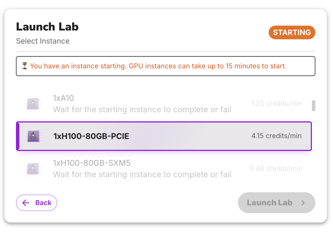 The GPU servers may take up to 15 minutes to launch compared to standard Lab
