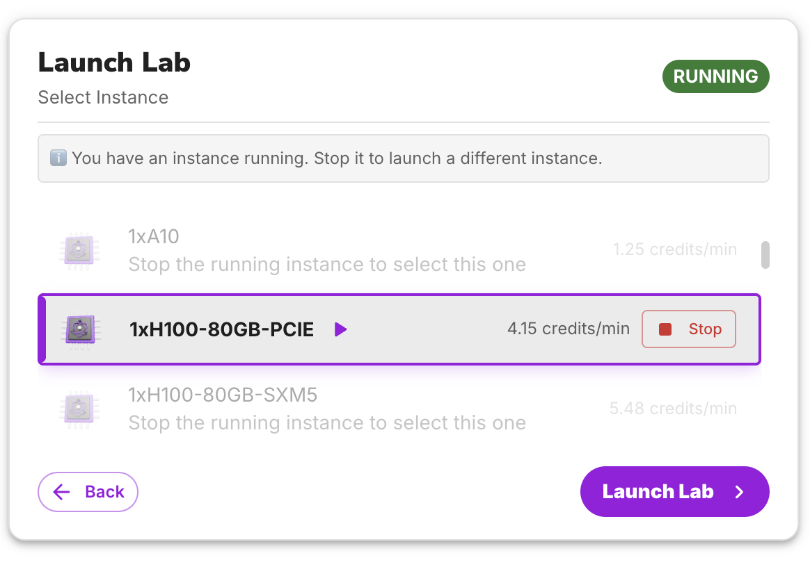 Use the drop-down at the top of your account page to select the GPU Lab image, and then click Launch Lab.